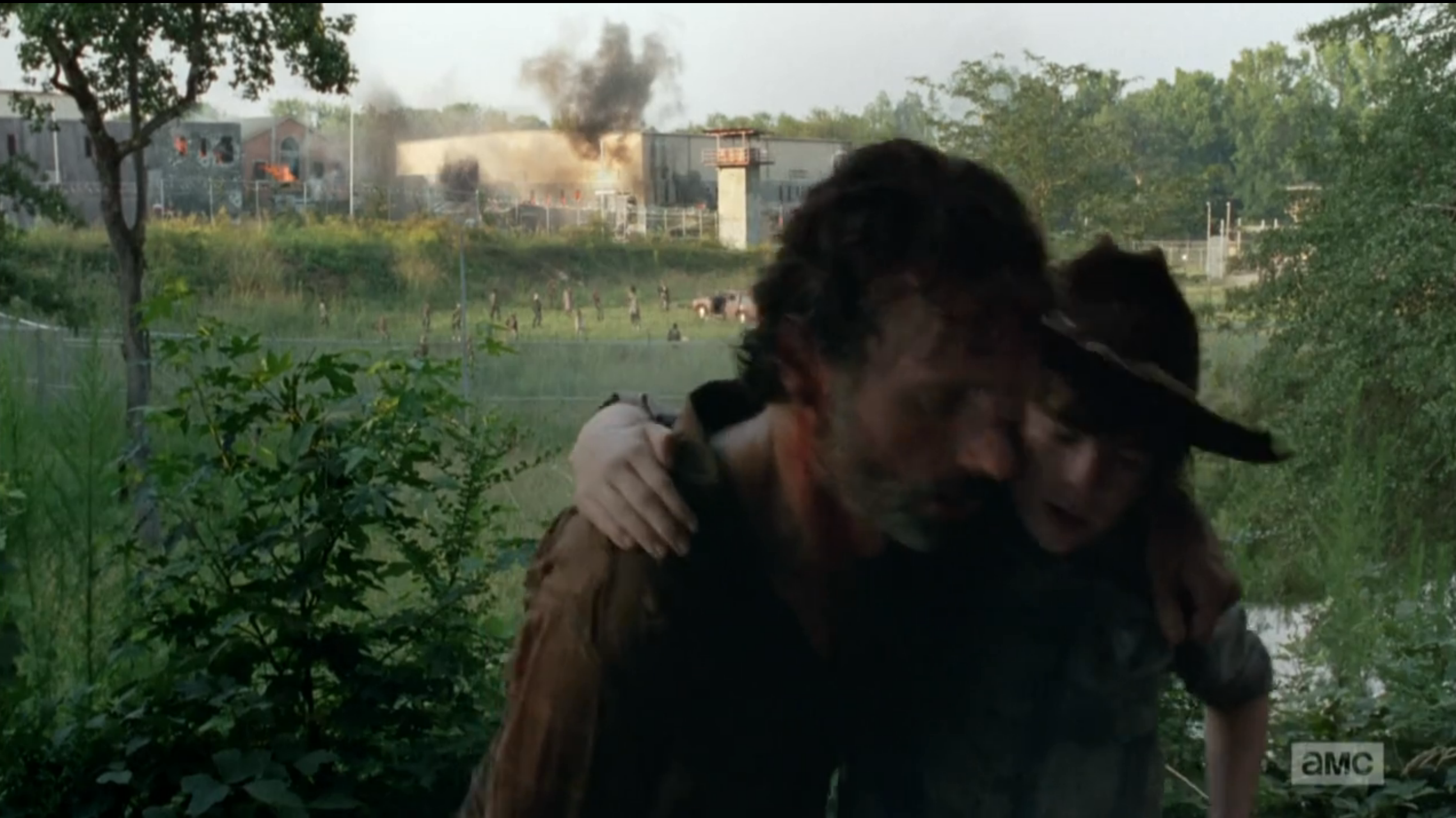 In a final closing parallel moment to the Season 2 finale, we see Rick and Carl limp away from the overrun prison as it burns. The closing moment of Season 2 showed the fortified prison off in the distance as a glimmer of hope. Now, with Season 4 halfway done, we see that the prison has fallen. Its walls have crumbled. The hope it once offered has been shattered. There is nothing left for Rick and his son to do except to move forward and not look back. “Just keep walking.”