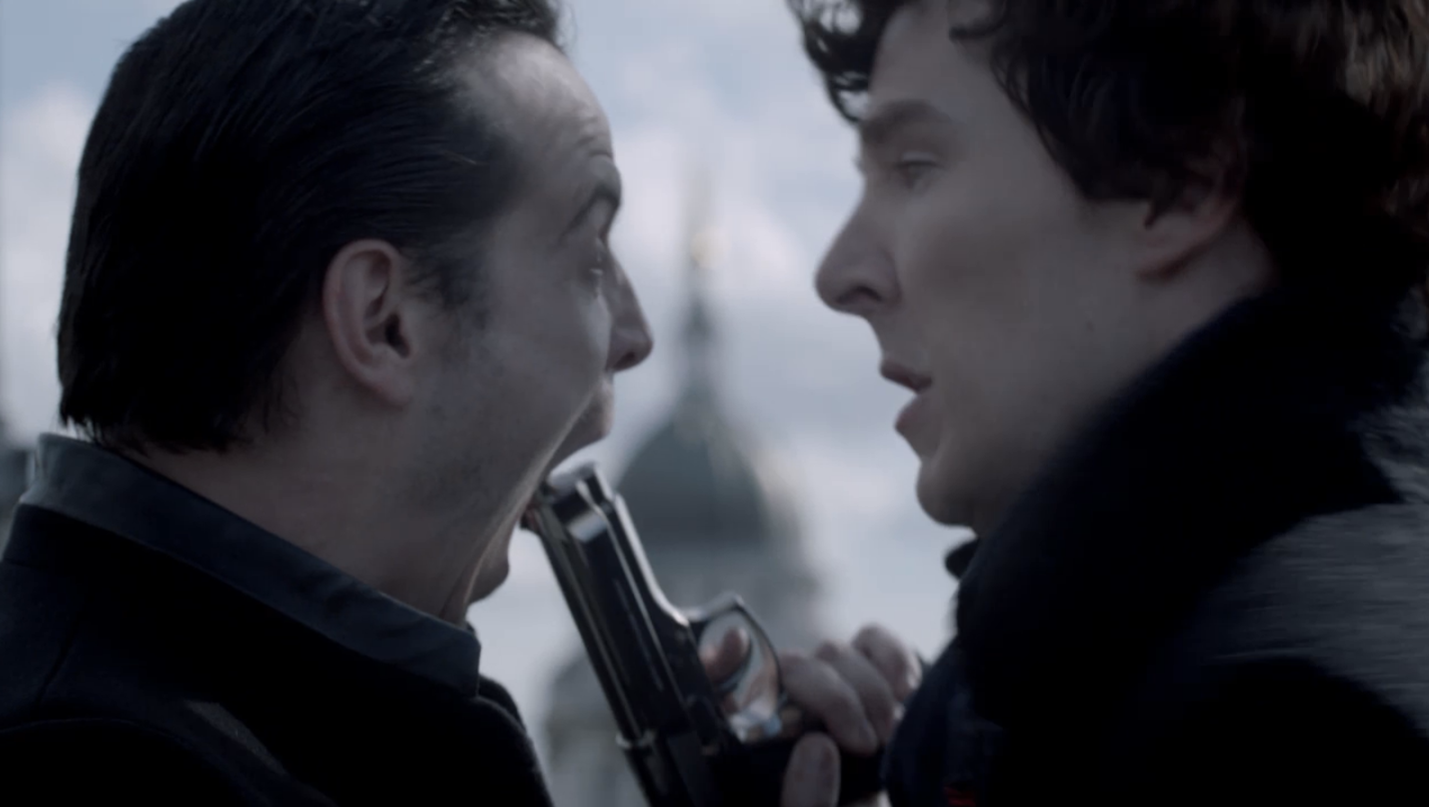 Sherlock struts around Moriarty painting the picture that Moriarty himself can save Sherlock. Sherlock knows Moriarty is obsessed with him. If he wanted him dead, he could have had Sherlock killed ages ago. No, Moriarty wants to ruin him and make him feel he’s lost. So the only way to destroy Sherlock’s latest glimmer of hope, is for Moriarty to kill himself. This works for Moriarty for two reasons: