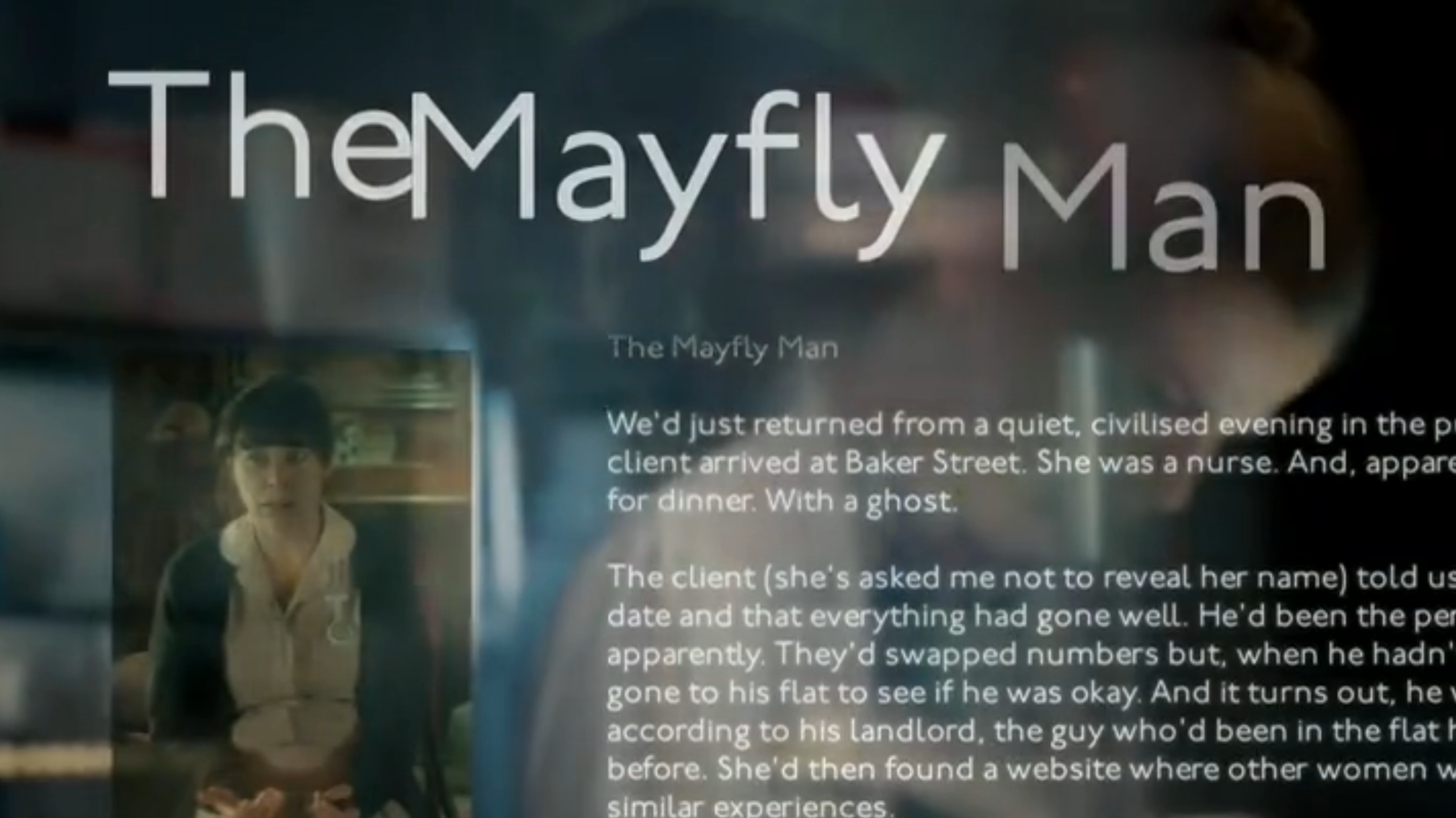After only being out for two hours, they return home to find a new client who believes she went out with a ghost. Sherlock later deduces that this man was assuming the identities of men who lived on their own and just died. By taking their names and using their now vacant apartments, he could have his string of one night stands. Thus making him a ‘mayfly’ – only living for a day