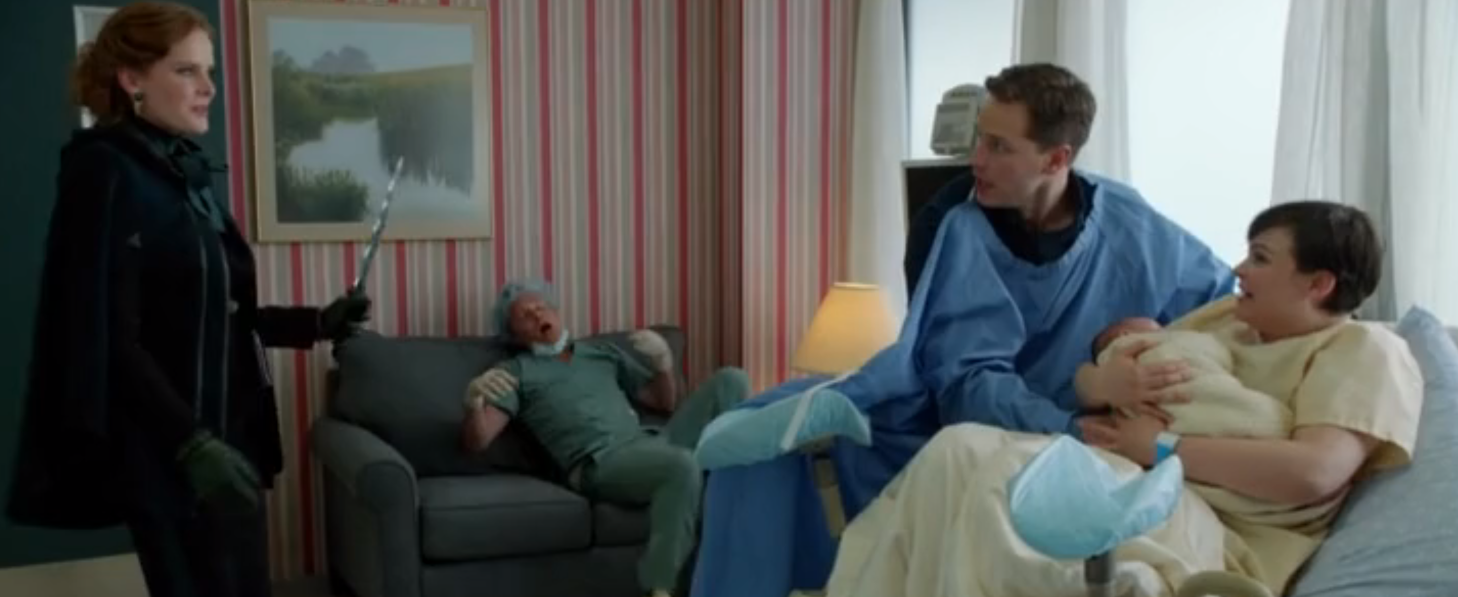 We pick up right where last episode left off with Snow going into labor. As Snow is wheeled off to the delivery room, Regina and Emma start to set up their defenses. Whereas Regina’s magic might not be strong enough, Emma’s light magic barriers should be enough to hold Zelena at bay – more on this in a second. Throw in some dwarf lookouts and a lobby full of trained archers and you have a family that isn’t going down without a fight.