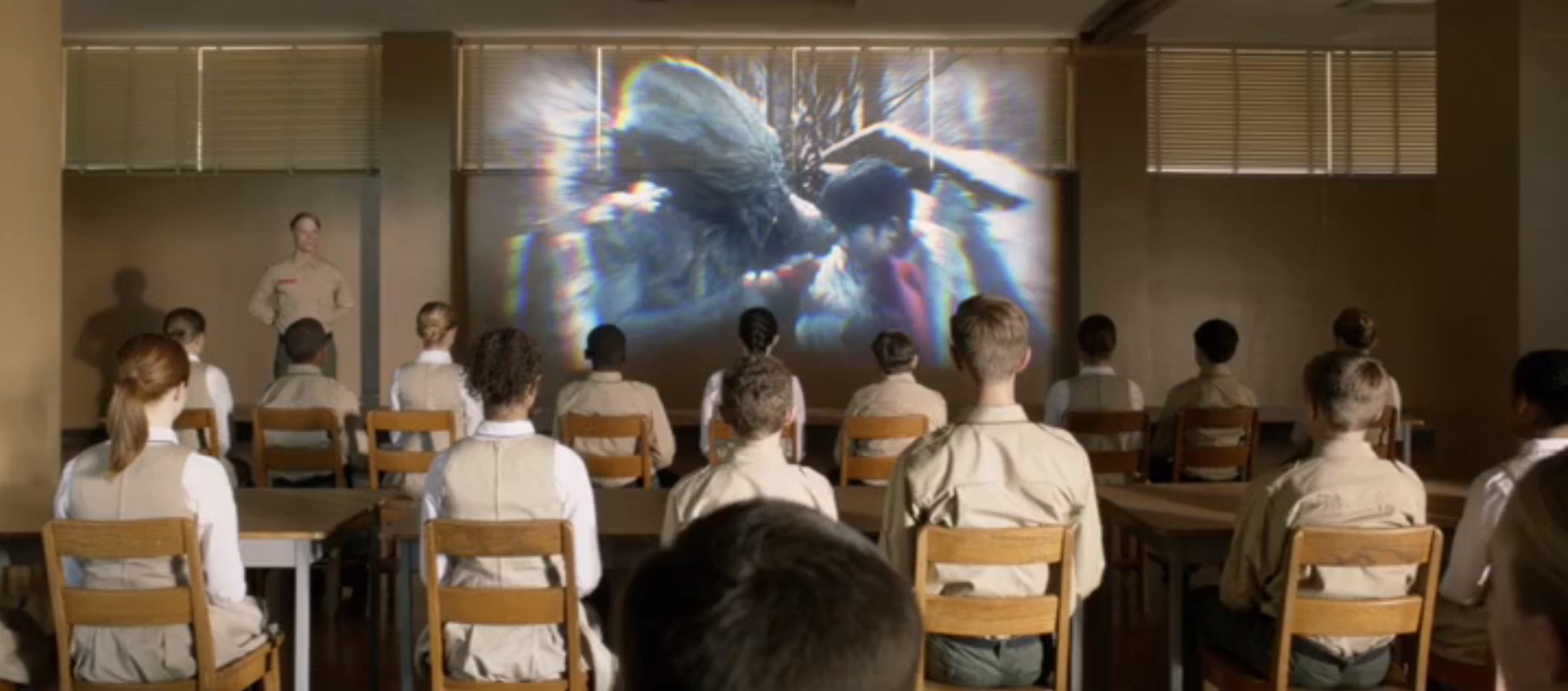 The entire set up and situation also has a very Hitler-youth feel to it; although it can’t compare to just how disturbing this scene is as a whole. From the girl overzealously proclaiming a bright and glorious world with the Espheni to the crowd of chidren who in a second start blowing their whistle to report someone who is “out of line”, there is so much creep-factor in this scene it’s hard to imagine how you’d be able to hold up in that setting. Thankfully – or maybe not – we don’t have to imagine, because we have Matt.