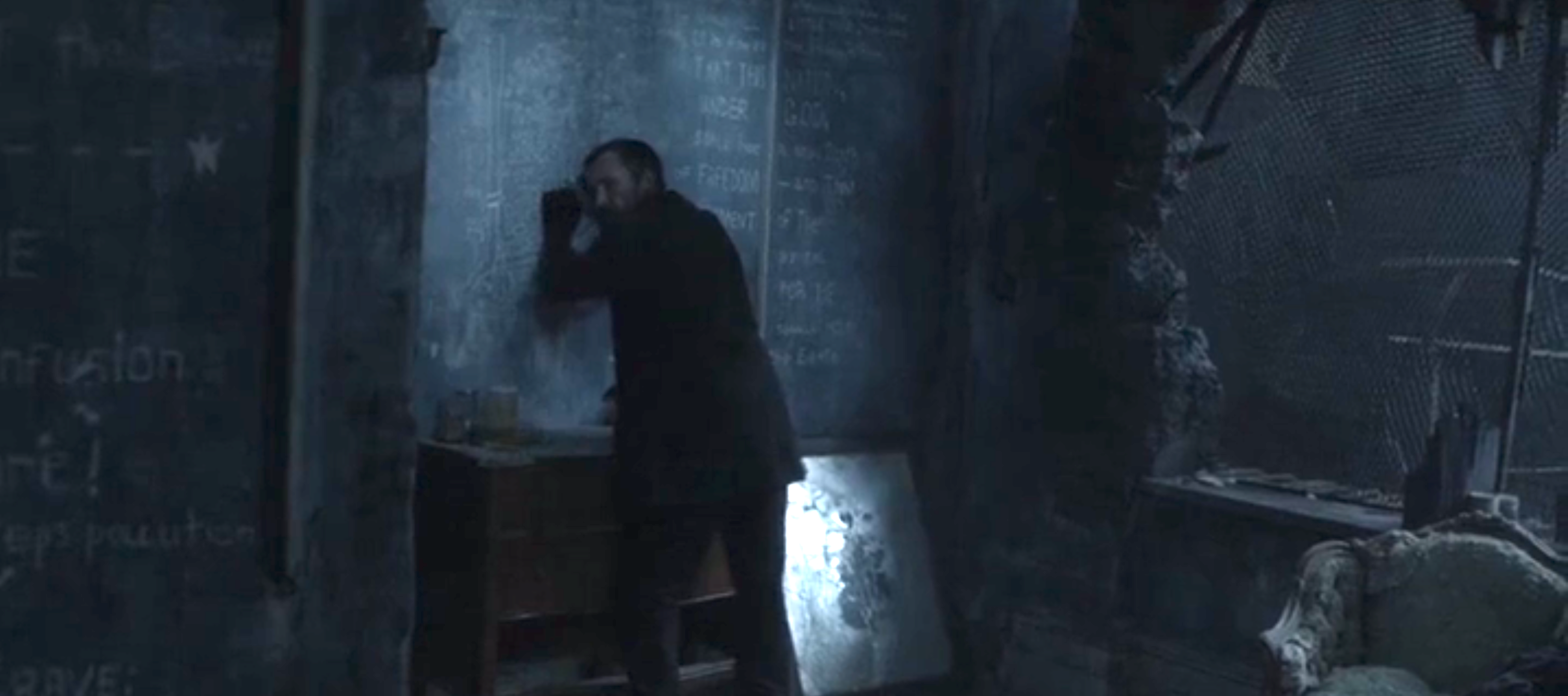 The next group of importance – and actually the first we meet – is composed of Tom Mason and Dan Weaver who are currently being held in solitary confinement above the slums of Charleston. Once again, we start off a season with Tom Mason being captured by aliens – Season 2 Déjà vu much?. Though unlike last time, Tom is in more control than the Espheni think. They might think he’s just writing the Gettysburg Address and other historical documents on the wall; but he’s actually been detailing an escape route and the location of all Skitter sentries.