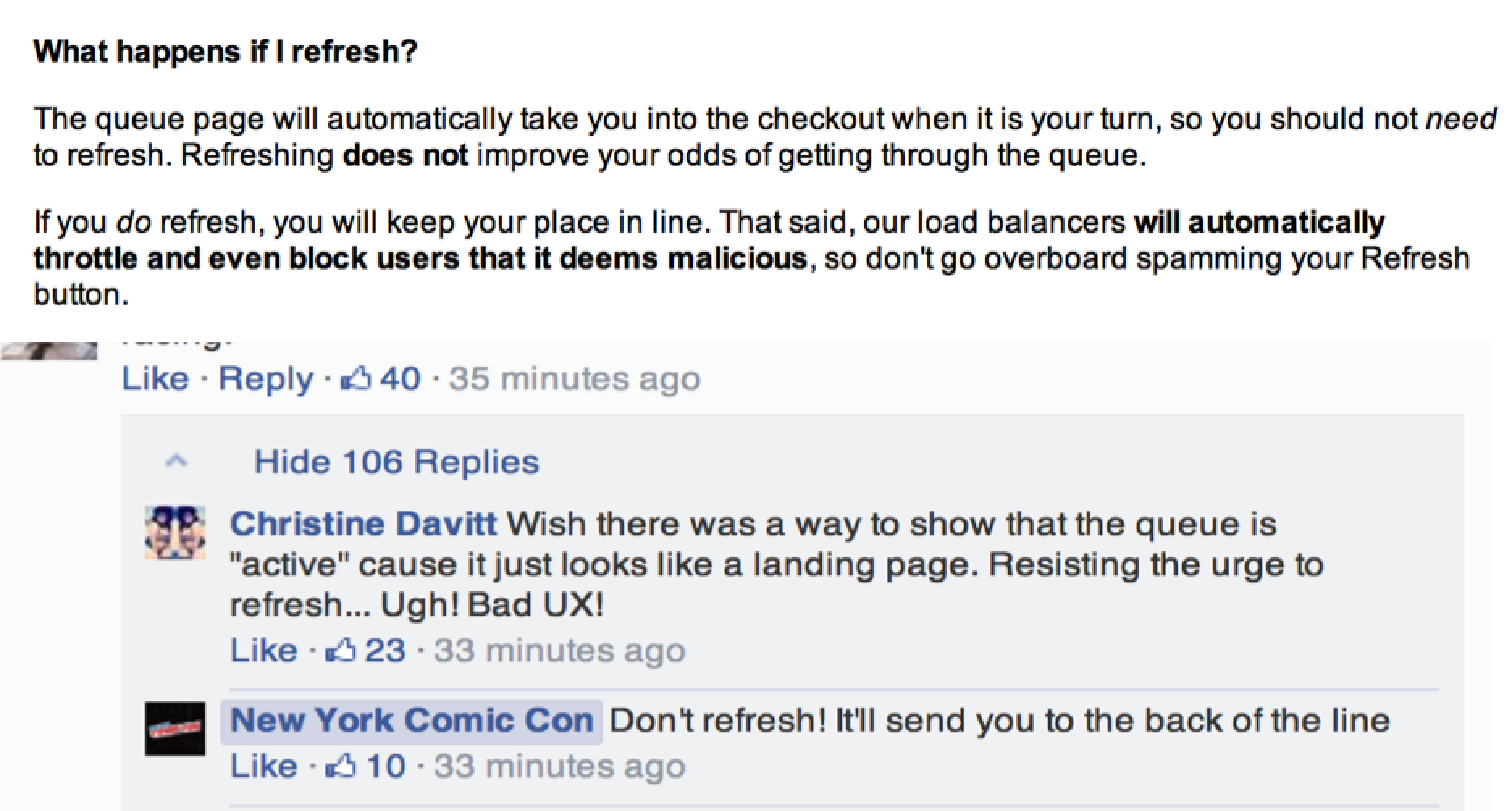 Once on the Queue page, we read what the page entailed and it explicitly stated that the page would automatically refresh itself. Manually refreshing the page wouldn’t help you move faster; however, it also wouldn’t make you lose your place in line. It wasn’t until over 10 minutes later that their Facebook page urged users to NOT hit refresh as this would return them to the back of the line.