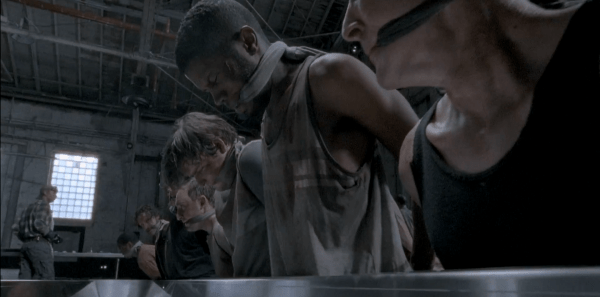 In the trailer we see our heroes bound and gagged as they’re told that the Termites ‘didn’t want to do this to them’. Could this be torture maybe? Though the guy who looks an awful lot like Shane swinging a bat at Glenn’s head seems a bit much. As we watch more of the scene unfold we realize this goes from bring ‘cruel and unusual punishment’ to just down right ‘what the eff?’.