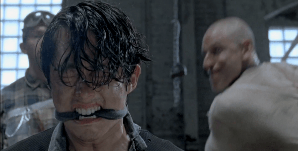 During one interrogation-like scene we spy one guy in a heavy plastic apron covered in blood splatter. To make matters worse, we see what appears to be meat hooks in the background of our tied up heroes. Though the most disturbing evidence comes when we see a man hovering over a table while the sound of a buzz saw can be heard. The screen gets blurry which makes me think this is the last thing one of our heroes sees before blacking out – and hopefully not worse. If this had all been one huge misdirection, then it’s a brilliant one; but there’s only so many ways that scene can be taken.