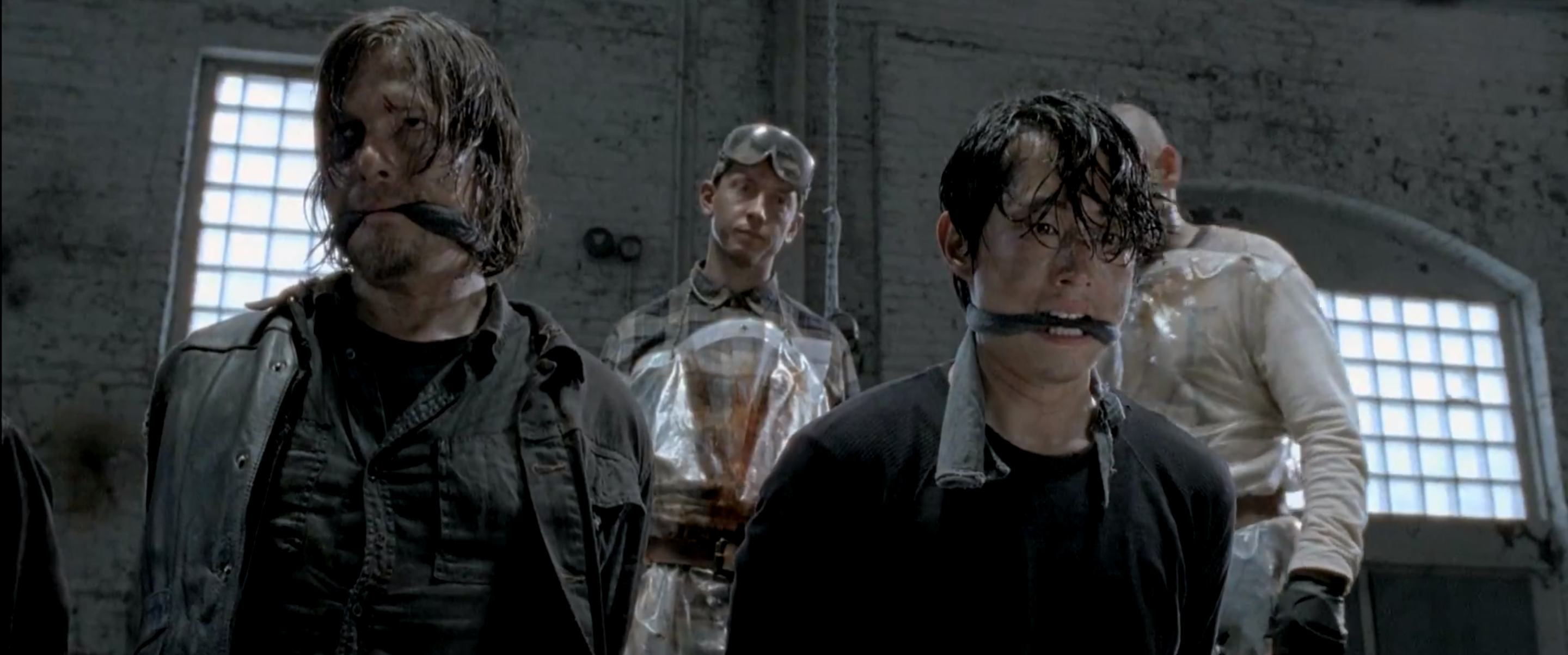 Interrogation2 Published July 25, 2014 at 2880 × 1204 in The Walking Dead Season 5 – SDCC Trailer Analyzed ← Previous Next → Lovely, a bloody apron. And is that a meat hook in the back?