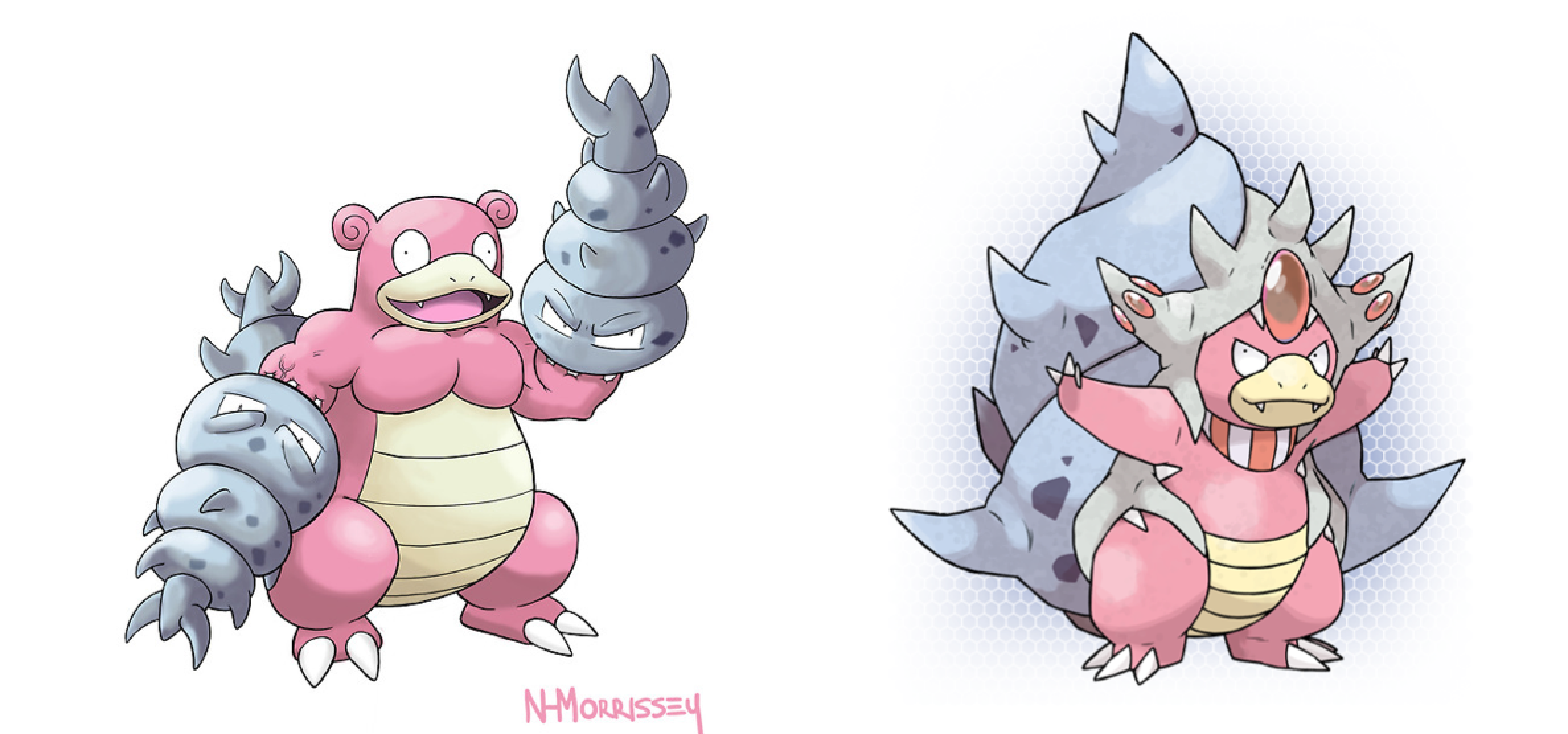 What in God’s (Arceus’s) name is going on inside that shell. He looks traumatized! That is Slowbro’s way of saying ‘I’ve seen things . . . horrible things’. Or maybe he’s just wondering how the heck he can manage now. The shell is so large that there is no way for him to stand except for propping himself up on his tail. Looks like dragging around a Shellder on your tail all those years was an awesome workout plan. Between his own weight and the weight of that shell armor, Slowbro’s mobility is seriously lacking.