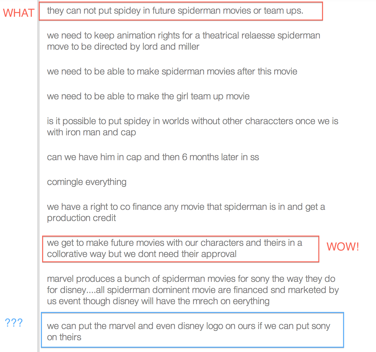 In the email memo to herself, Pascal plans to inquire about using Captain America to also set up their Sinister Six movie – which is already in the works. The fact that they’d keep working on their Sinister Six movie – part of the Amazing Spider-Man universe – and start working a new Spider-Man is an awfully confusing and universe – violating idea; but that’s not what’s bad. Despite earlier insistence that any use of Spider-Man in Captain America: Civil War has to be approved by Sony – and will only be a ONE TIME THING – Pascal later goes on to write that Sony can use any Marvel characters and DON’T need their approval . . . huh?