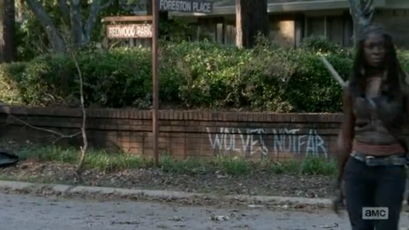 This was a very quick moment; but while at Wiltshire, there was spray paint that said ‘Wolves Not Far’. Considering the preview for next week shows some wild dogs finding the crew, it’s possible this was a warning about ACTUAL wolves. Though my theory is that this actually refers to a group.