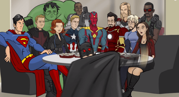 Of couse it’s not a How It Should Have Ended without a visit to the Superhero Café where we find ALL the Avengers with Batman & Superman, who point out that Vision is kind of a Superman-esque character – purely good, lasers, similar colors. Though the ever intelligent Vision simply turns this around into some good ole Batman v Superman action – where we find Batman still trying to goad Superman into a fight – a recurring theme in Superhero Café clips. In the end though, all agree with Captain America that there shouldn’t be a “Civil War” except Ironman – a joke about the Captain America vs Ironman dynamic of Captain America: Civil War.