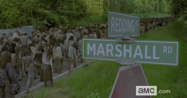 Early on in the trailer we see the sign for Alexandria falling down. Well that’s not coincidence. If one theme of the trailer was blurred lines of opponents to Rick’s way of life, then the other was the fall of Alexandria. We see multiple shots of seas of walkers, which could very well be a Mega Herd; but there are just as many shots of these walkers around trailers. Do you remember who uses trailers to hold walkers? That’s right, the Wolves!