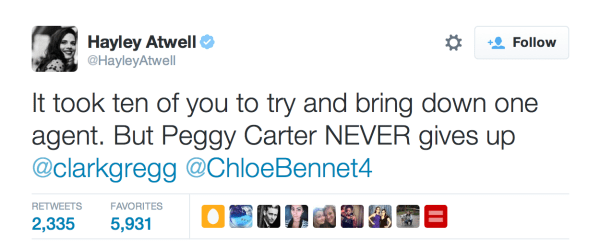 Although she wouldn’t admit defeat just yet! Peggy Carter helped found S.H.I.E.L.D. after all, so she would have her revenge. And Clark Gregg wouldn’t expect anything less from her.