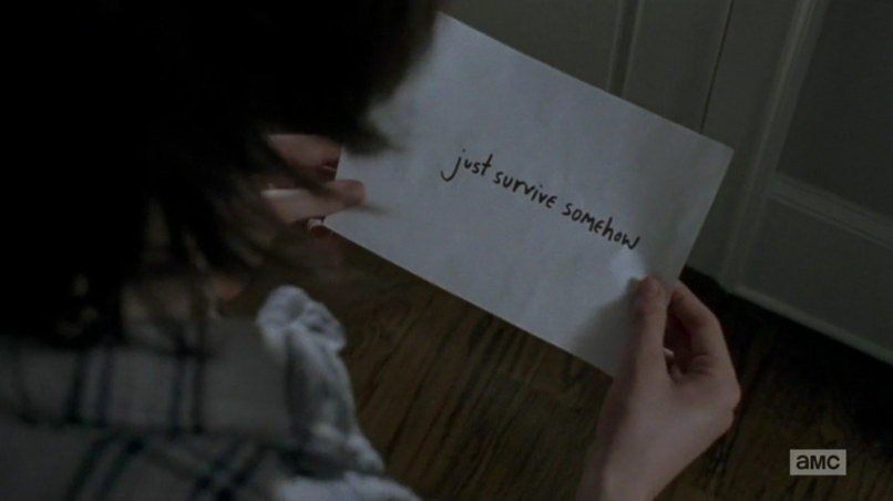 As the episode began and we saw Enid always wrting the letters JSS, we knew the meaning behind these letters would explain the episode title by the same name. So what did it mean? Just Shoot Something? Was it an abbreviation of Jesus without the vowels. Well both of those are wrong as we learned by episode end that JSS is Enid’s mantra after her parents death “Just Survive Somehow”. Although if we look at the episode beyond Enid, we actually see this idea all over the place.